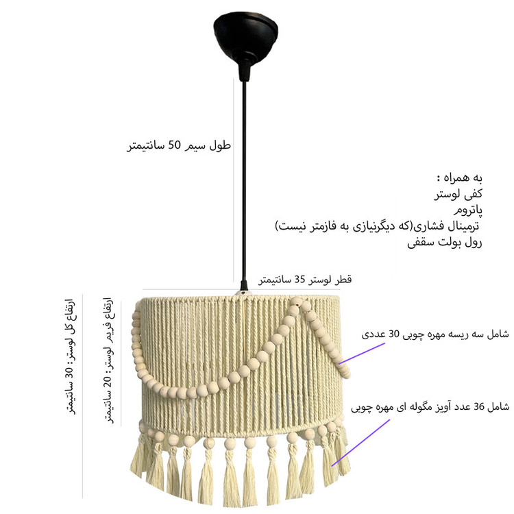 لوستر مهره چوبی مراکشی شامل سه ریسه 30 عددی مهره چوبی و 36 عدد آویز منگوله ای می باشد . انتخاب رنگ به معنای انتخاب رنگ نخ مکرمه است. ابعاد فریم لوستر 35*20 سانتیمتر و ارتفاع منگوله های آویز 10 سانتیمتر می باشد.